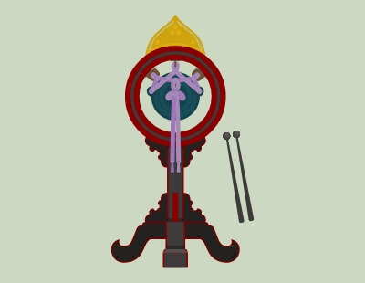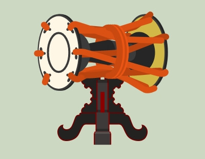 楽太鼓(がくだいこ)は雅楽の三鼓の一つ、釣太鼓ともいう打物です。上方に金属の火焔飾りを立てた円形の木枠に彩色を施した太鼓を釣り下げたもので、雅楽の管絃の演奏に用いられます。